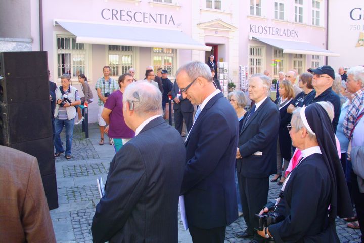 Dr. Günther Beckstein begrüßte die Anwesenden auf der Bühne vor dem Crescentia-Kloster